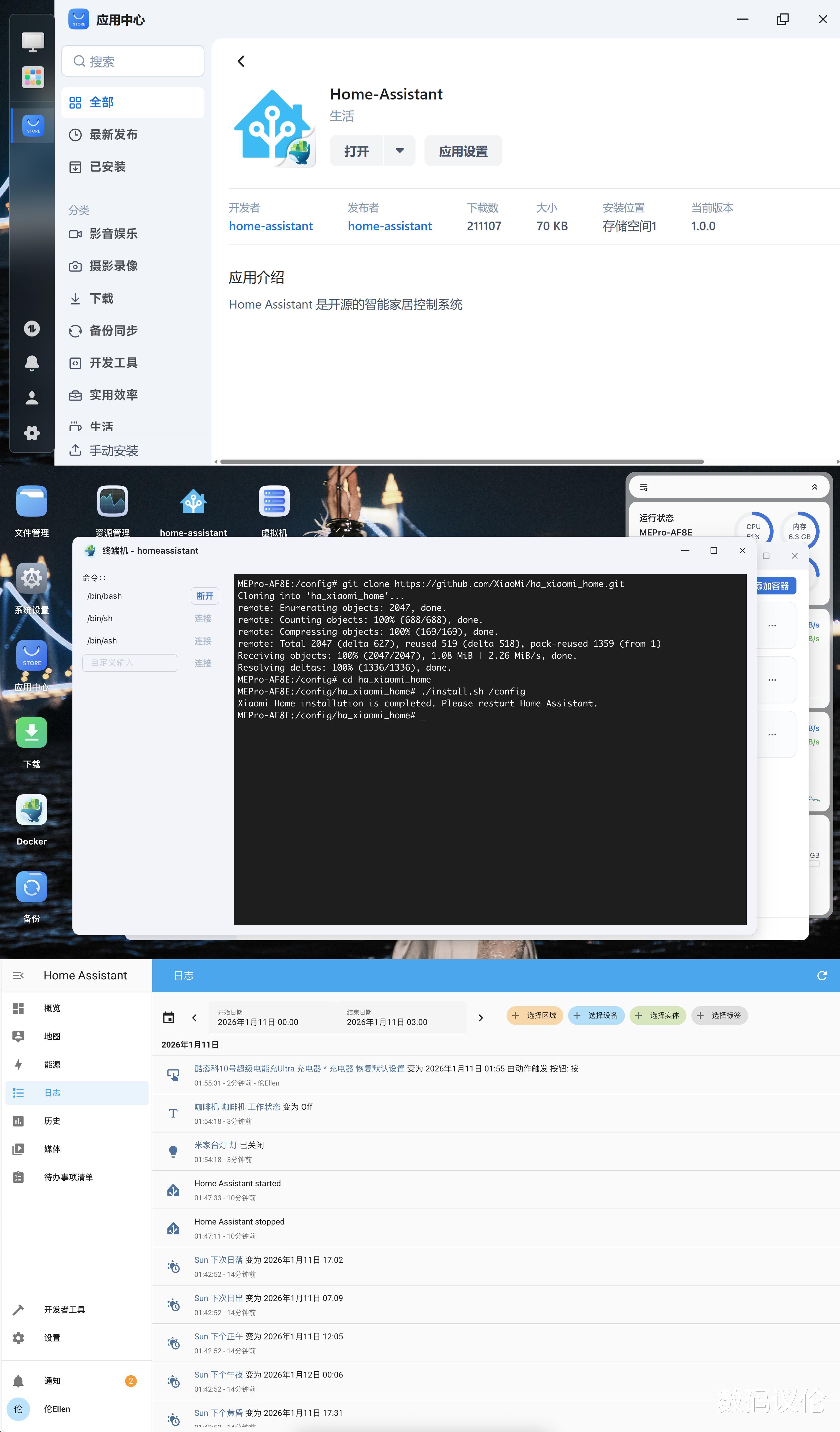 像是Home Assistant这种应用,可以直接帮你部署好Docker,配合米家等设备接入,就可以打造一个自己专属的智能家居控制中心。