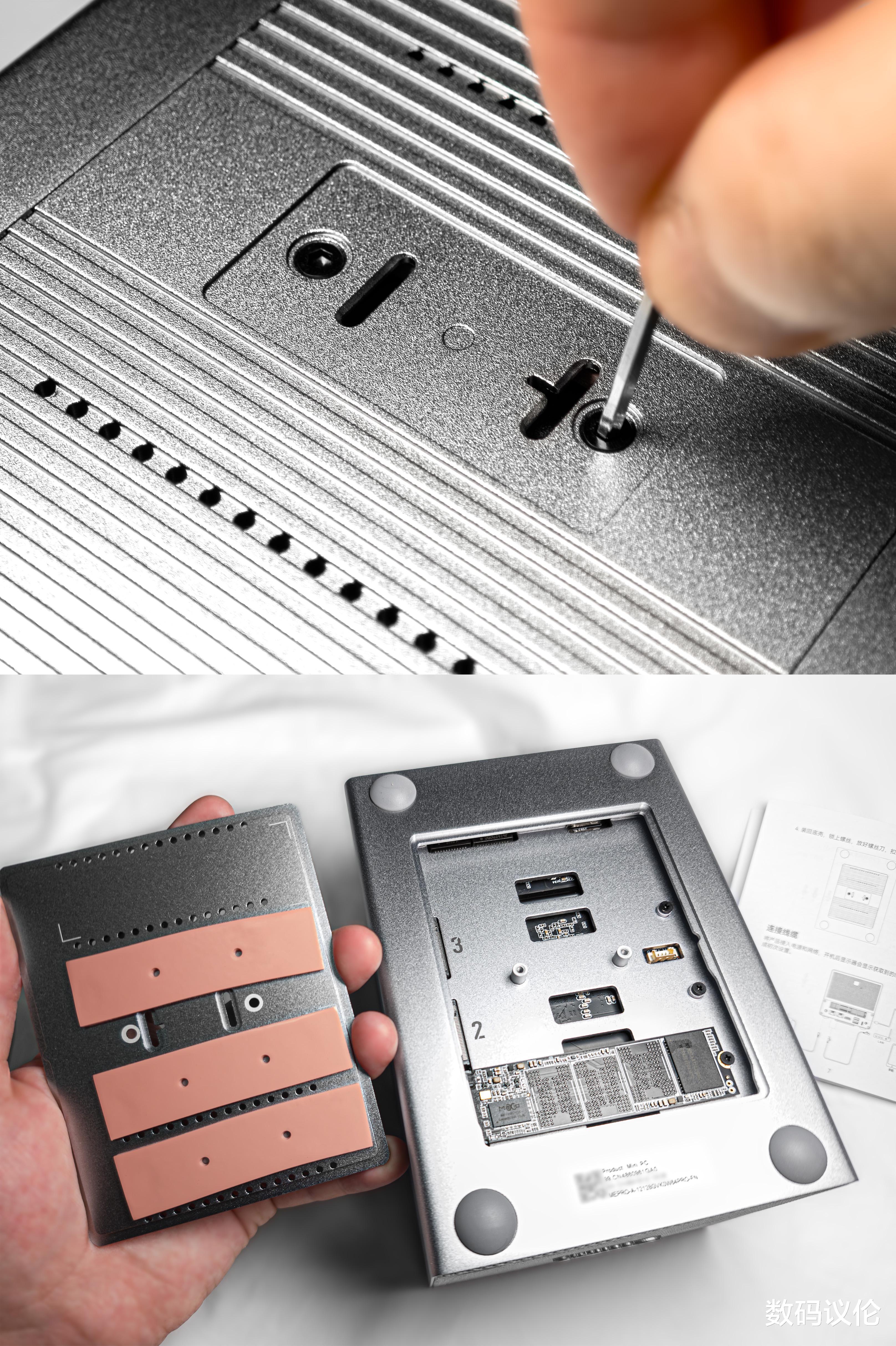 盘位同时支持2.5寸/3.5寸机械硬盘。如果安装2.5寸机械硬盘,需要取下散热垫后在底部拧上四颗M3*5螺丝;3.5寸则在左右两侧拧上四颗M3*4螺丝。