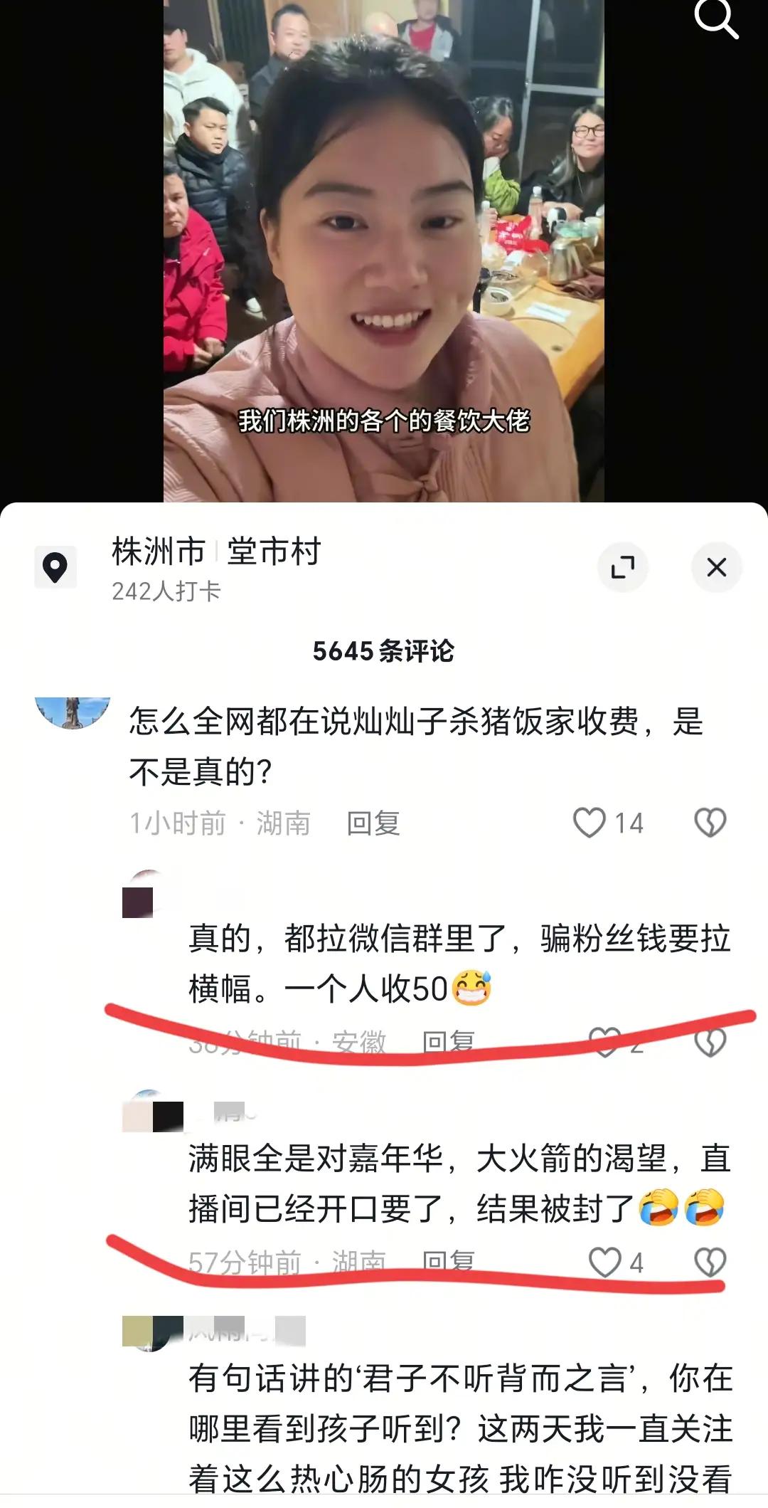 可1月17号,她又说能办了。因为快手有个2800万粉丝的妮姐,也是湖南人,愿意赞助灿灿子办杀猪宴。这下有底气了。没想到还是被上头叫停。