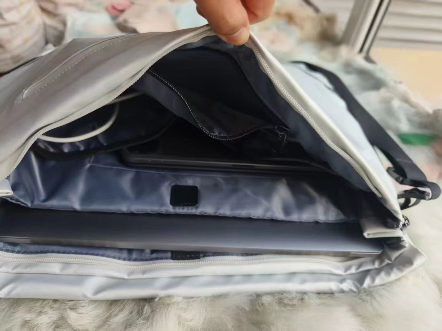 阿波罗X1的主仓内置独立电脑防震气垫隔层,我那台16寸轻薄本放进去后,被牢牢固定无晃动。隔层内层是2D二维防震缓冲技术,用的是高密度缓冲泡棉,既能缓冲撞击又防刮花。