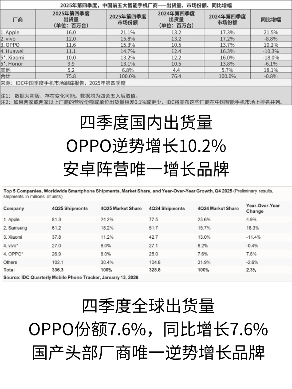 IDC 2025年四季度手机出货量报告新鲜出炉📊 整个国内市场同比微降0.8%,但OPPO居然逆势起飞:出货量1160万台,同比暴涨10.2%,是国内安卓头部品牌里唯一实现正增长的存在!市场份额也从13.7%冲到15.3%,稳坐第三把交椅👏