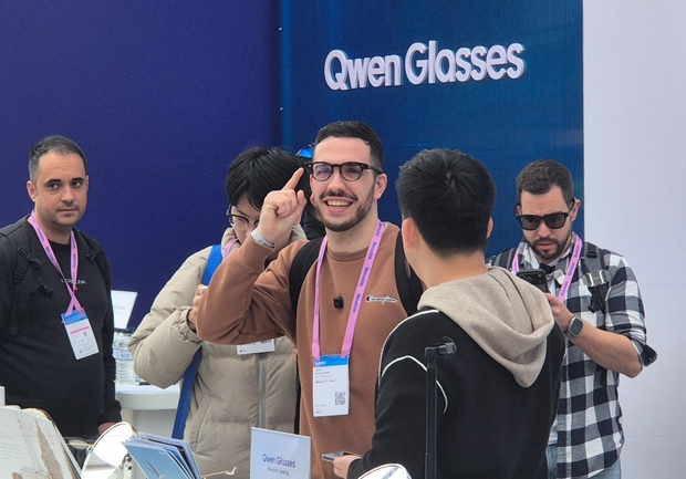 阿里巴巴通义眼镜(QWEN Glasses)展台人气火爆,来自亚欧多地的网红博主纷纷前来体验。该眼镜支持最高96种语言实时翻译,镜腿采用磁吸可更换双电池设计,有效解决设备耗电快的痛点。