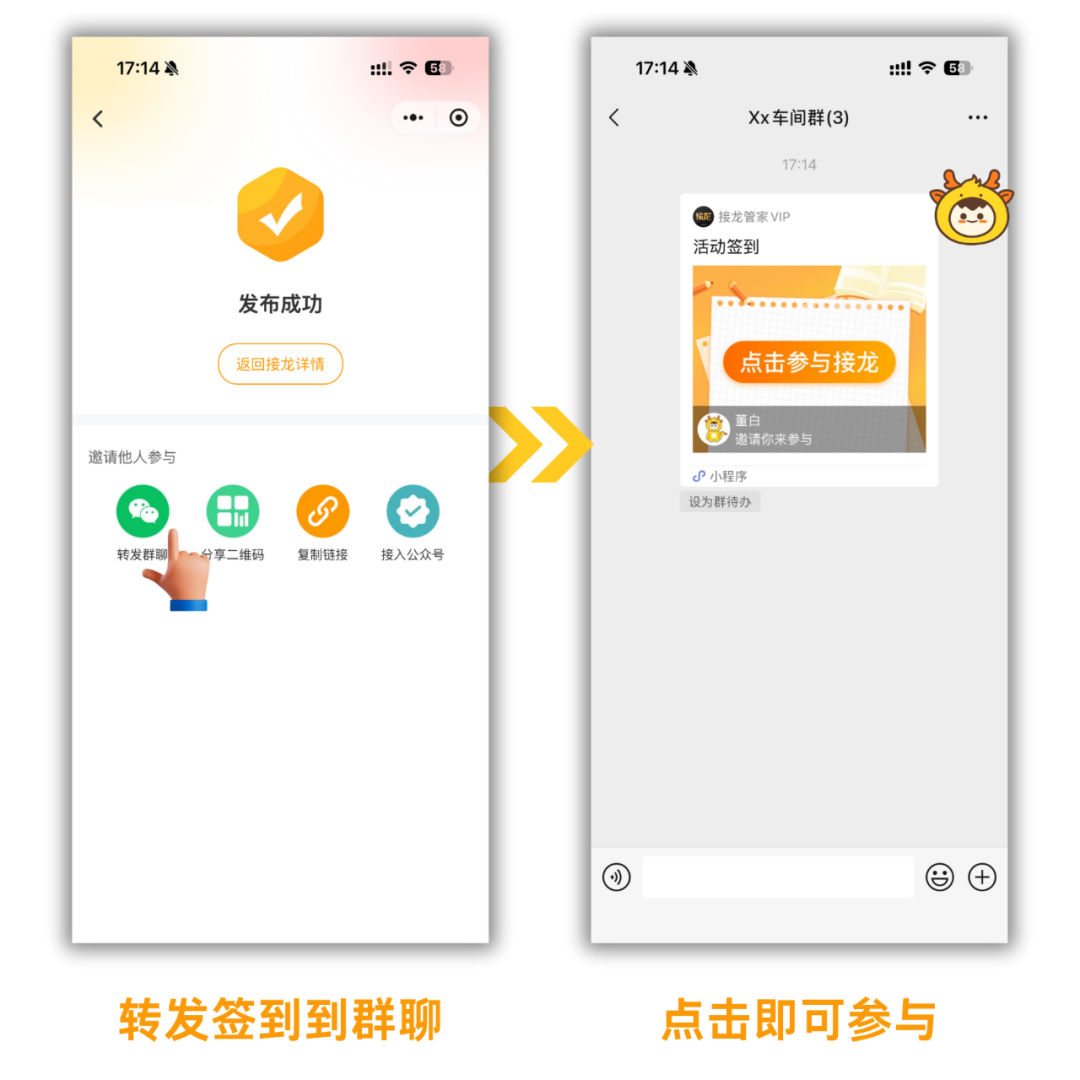 最优的解决方案是使用【接龙管家】,1分钟即可快速发起签到签退,0门槛操作,会用微信就会用接龙管家~