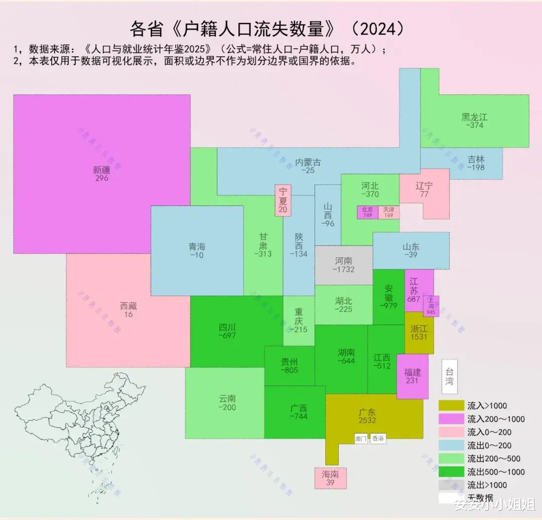 从 2024 年各省户籍人口流动数据来看,人口的迁徙版图清晰可见。