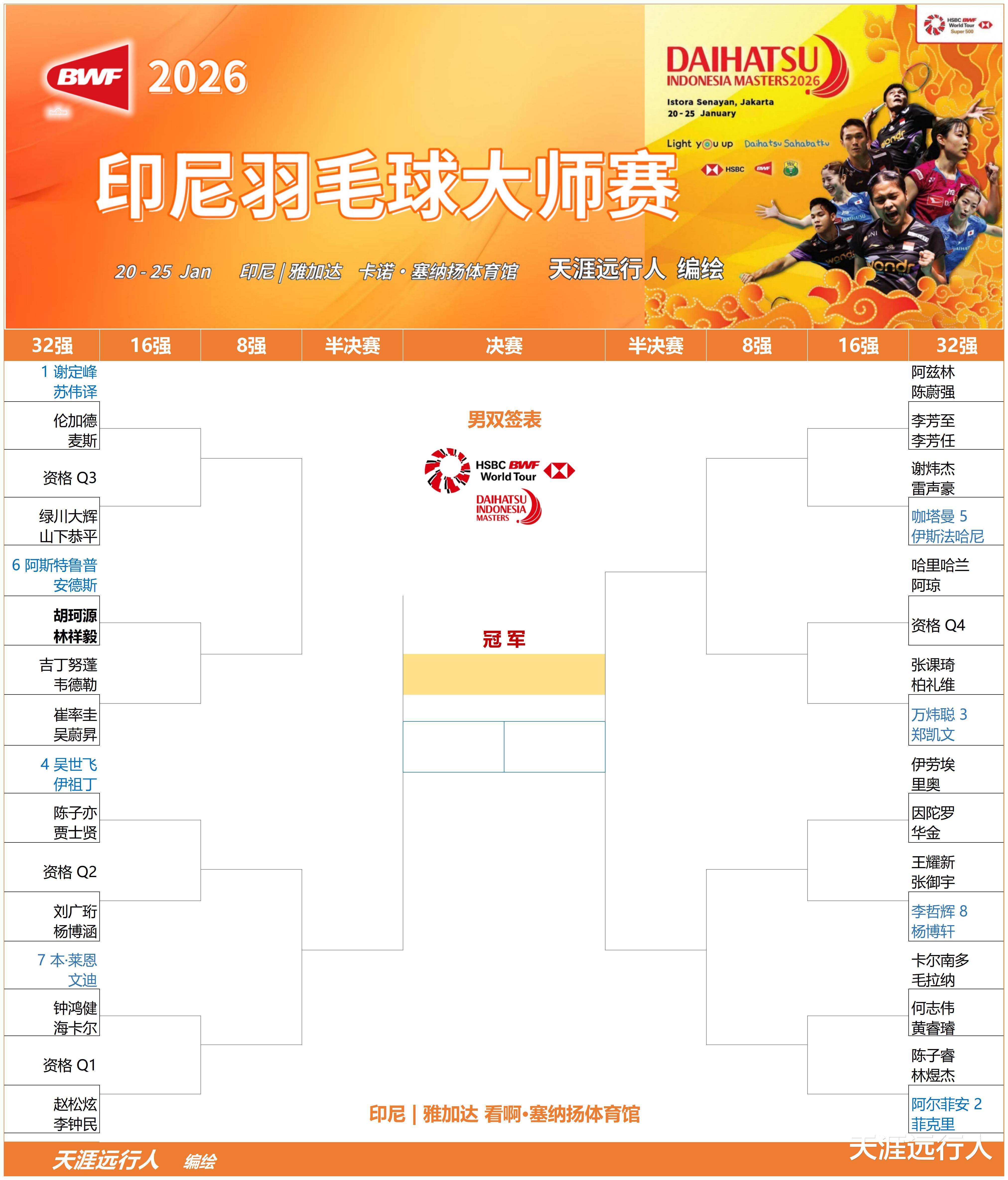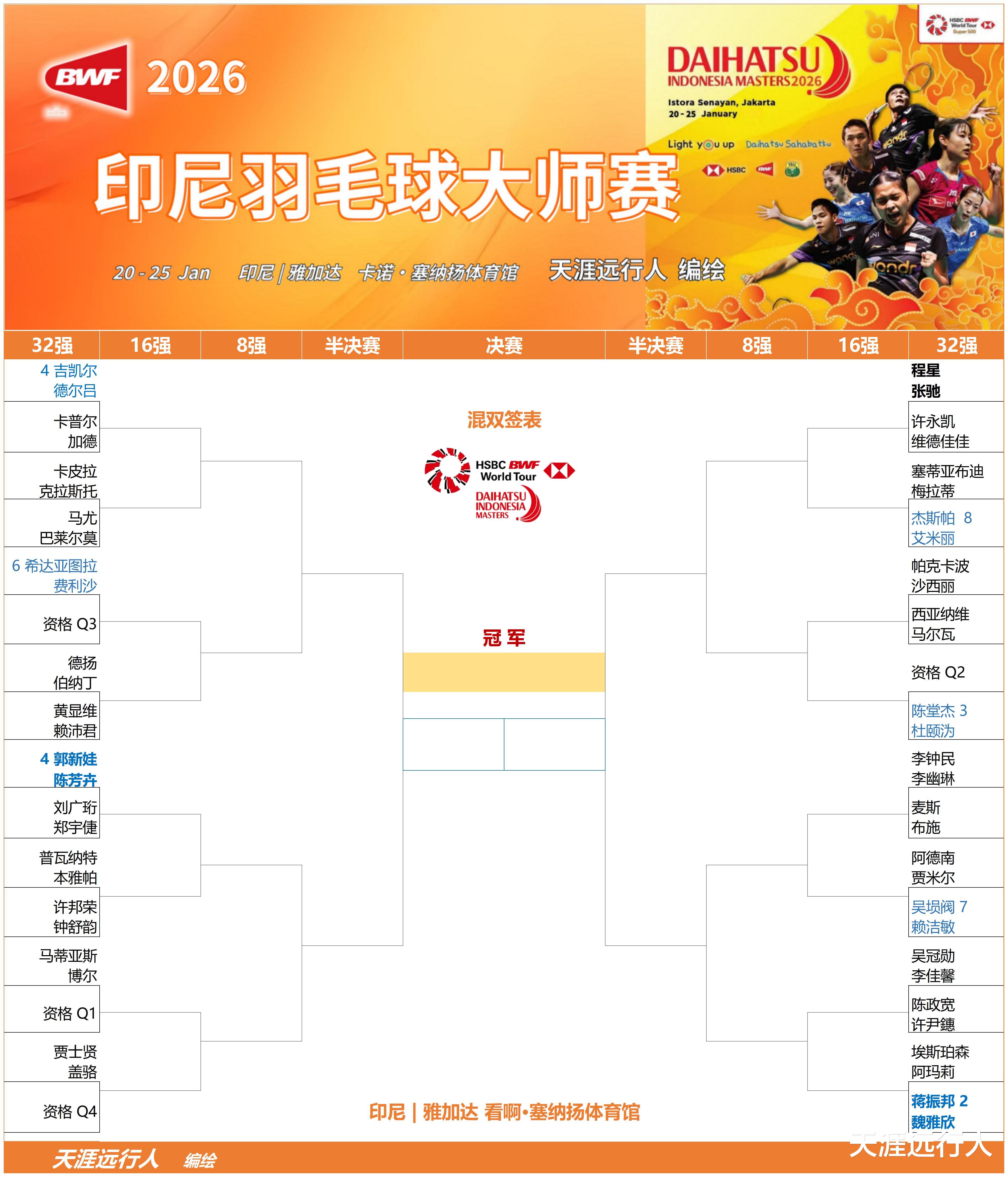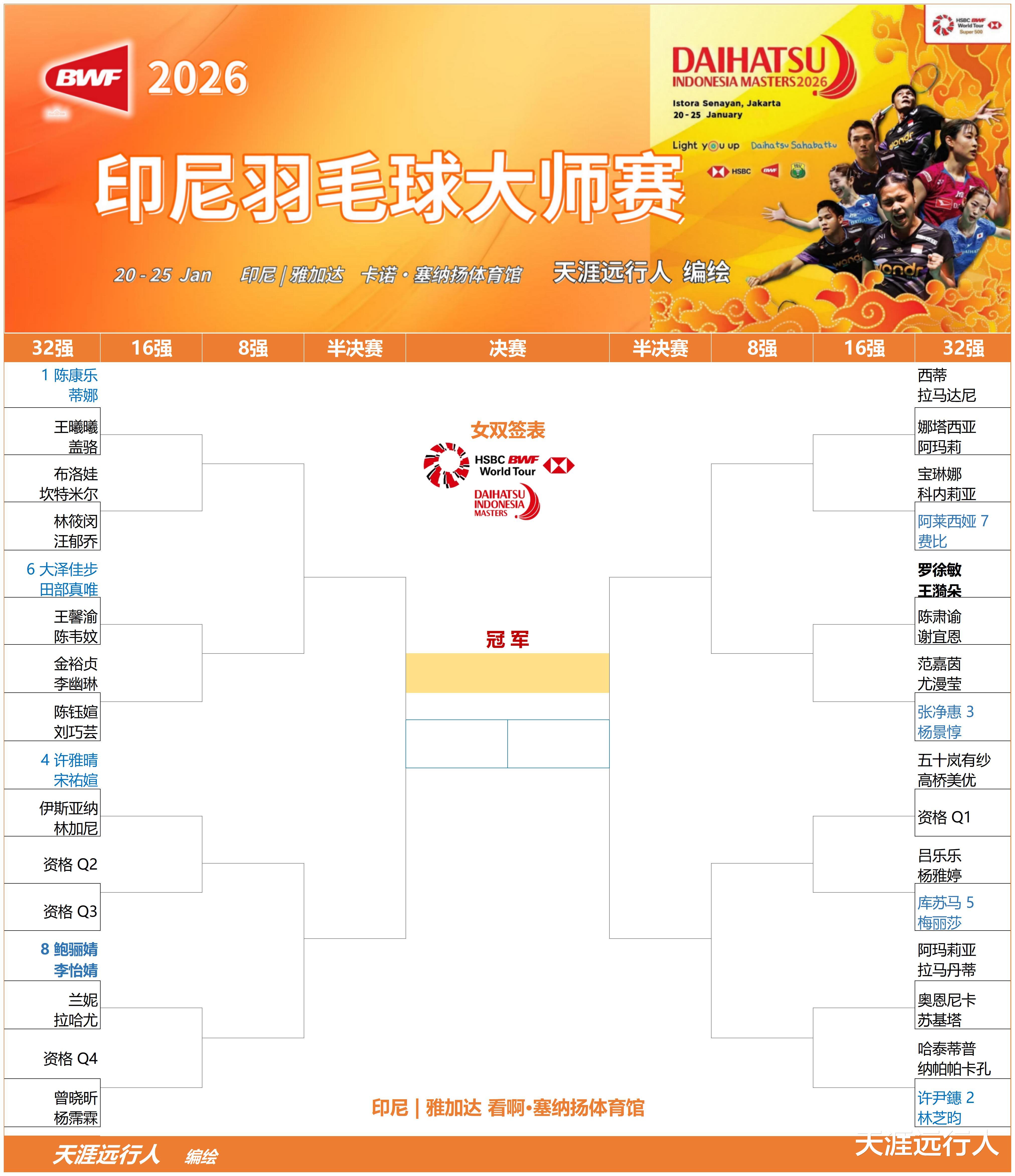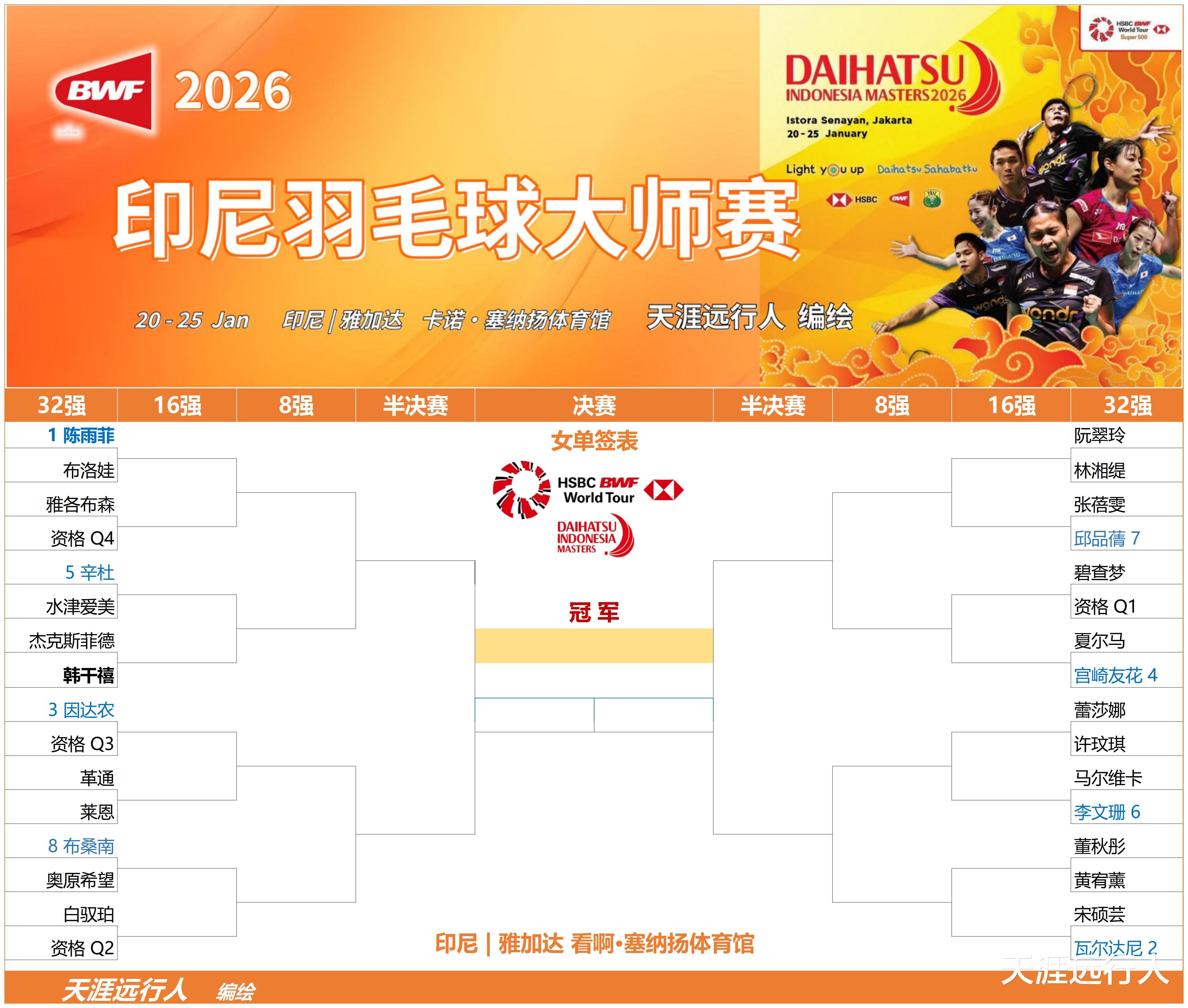 北京时间1月20日上午9时,2026世界羽联超级500印尼羽毛球大师赛将在印尼首都雅加达拉开战幕,经历一波退赛潮之后,各单项签表出炉,赛会总奖金47.5万美元。