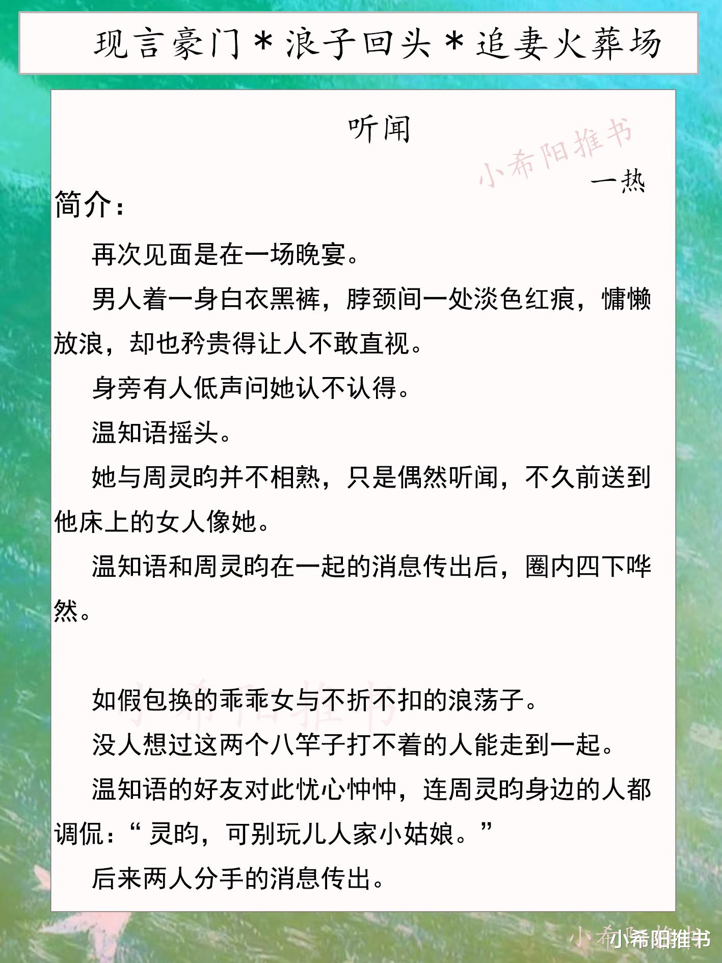 《听闻》,乖乖女温知语与浪荡子周灵昀,经典的设定两人双洁,后期男主浪子回头追妻火葬场~