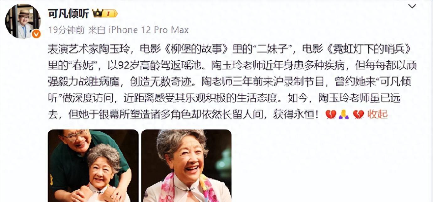 刚看到消息,心里哆嗦了一下。陶玉玲走了,92岁,走得挺安静。据说消息最先是冯远征在微博发出来的,跟着曹可凡也证实了——这不是坊间传闻,确实是真的。看到这个消息,说不郁闷是假的。那个《柳堡的故事》里的二妹子,《霓虹灯下的哨兵》里的春妮,那些经典画面飘到眼前,像老胶片一样慢慢转起来。