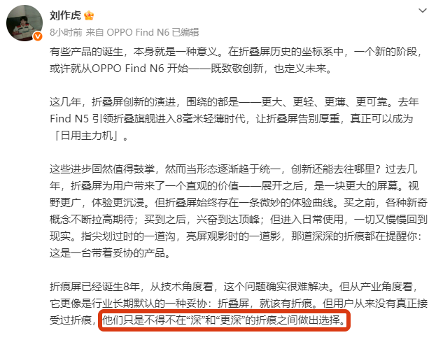 OPPO首席产品官刘作虎的最新微博里有句话说得特别扎心:“用户从来没有真正接受过折痕,他们只是不得不在‘深’和‘更深’的折痕之间做出选择。”
