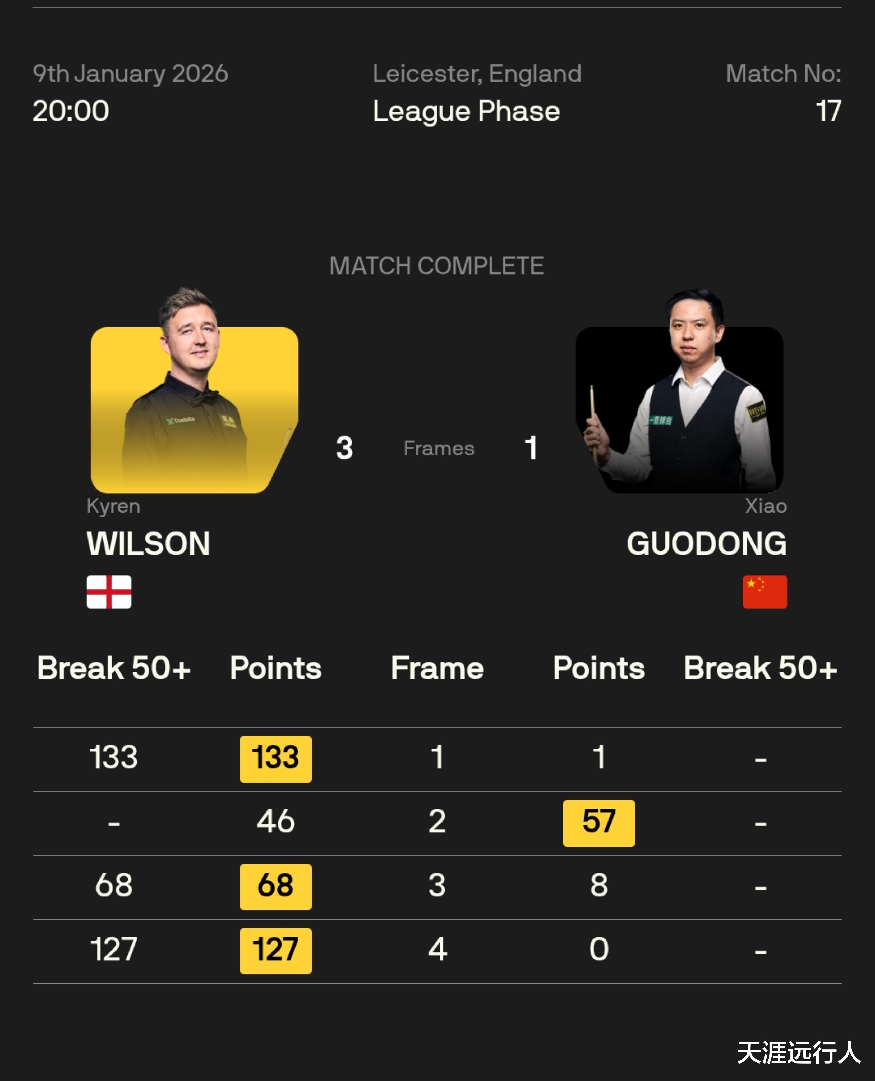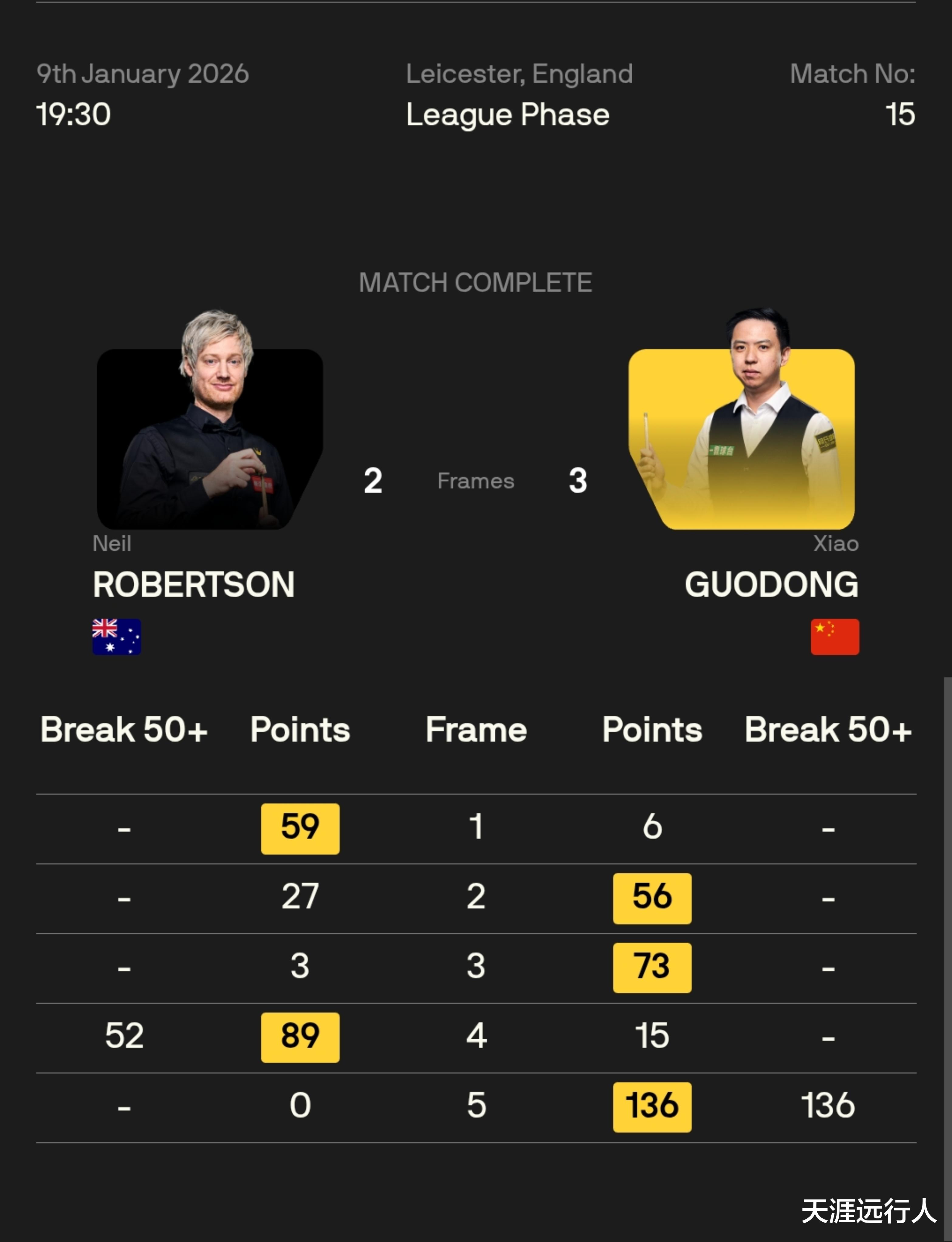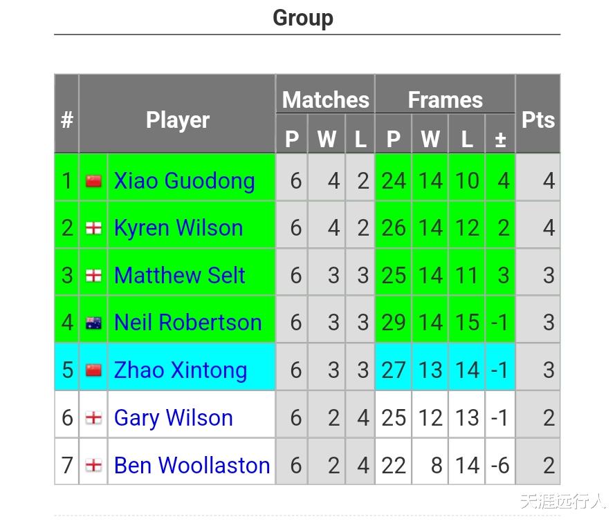 小组淘汰赛失利的尼尔·罗伯逊、凯伦·威尔逊、肖国栋三人,和小组循环赛第五名赵心童,自动落入接下来的第五组。