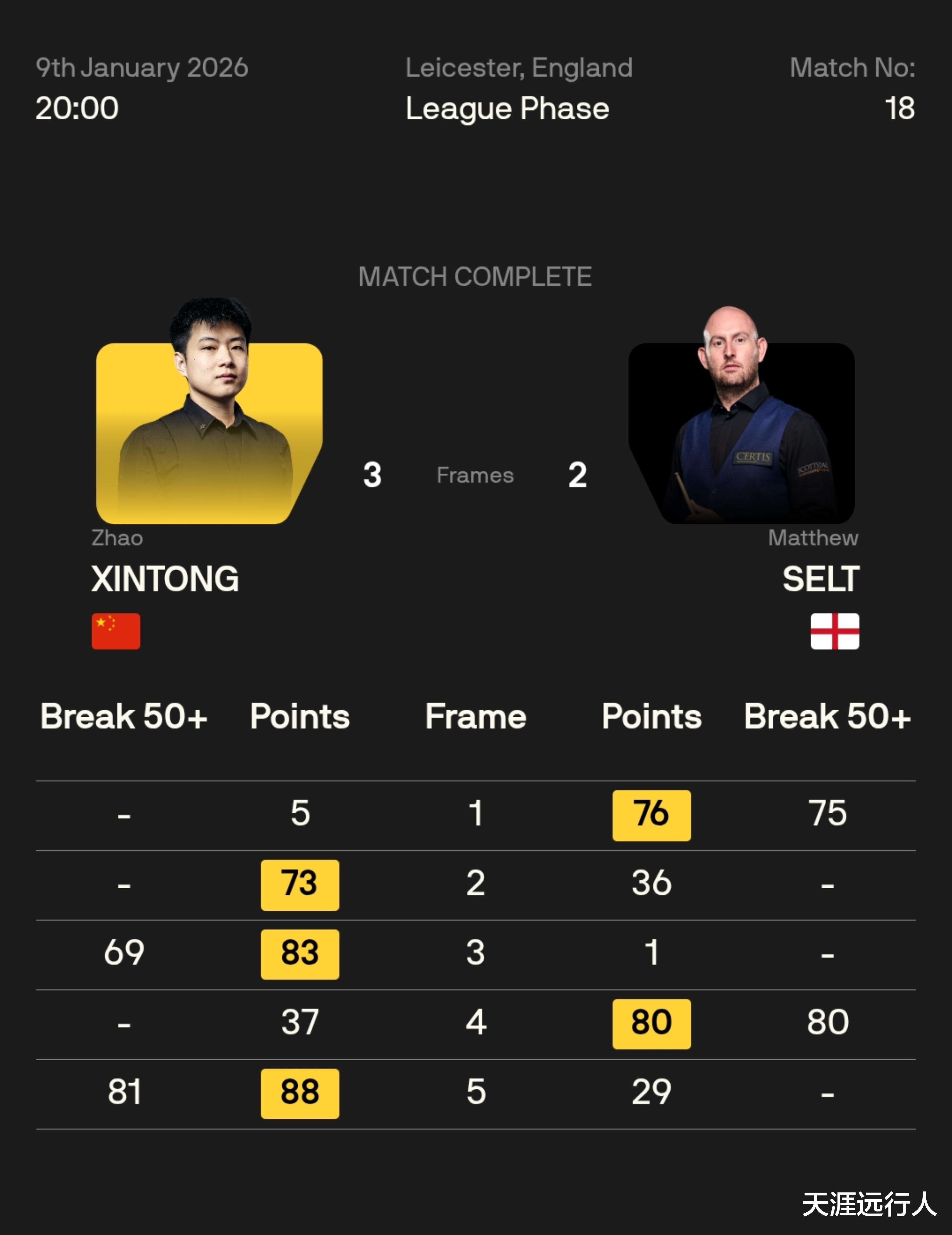 这个比赛日共打出九杆破百,塞尔特、囧哥和沃拉斯顿各打了两杆,肖国栋、赵心童、罗伯逊各打出一杆。