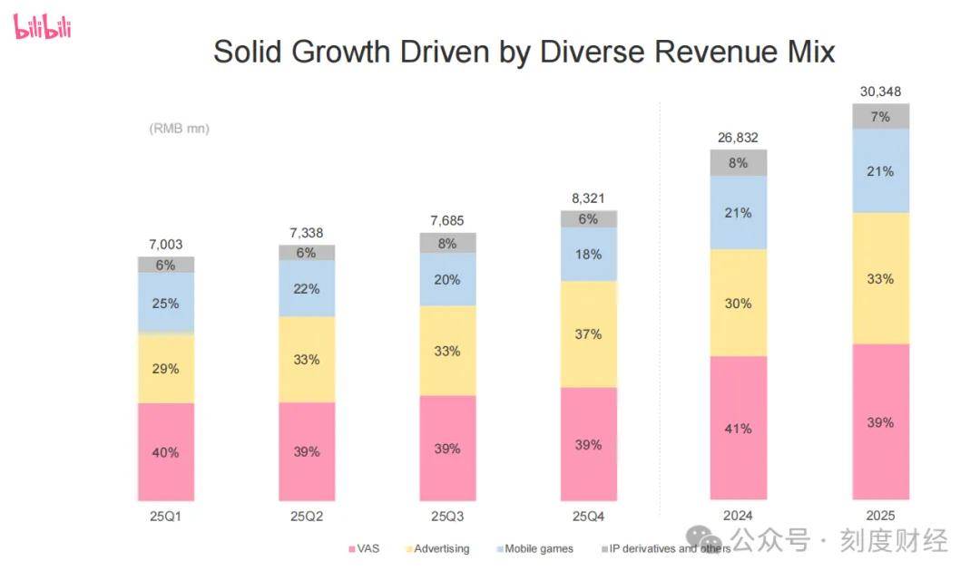 营收端的结构性分化,凸显了B站变现能力的不均衡。2025年B站总营收303.48亿元,同比增长13%,但这一增长几乎由广告业务独撑。