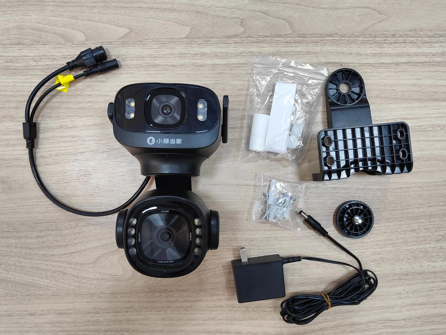 拆开,配件规整齐全:摄像头主机、安装支架、上墙螺丝 + 胶塞、电源、网线接口防水套、连说明书都标了重点,到手拧上几个螺丝就能用了,简单方便。