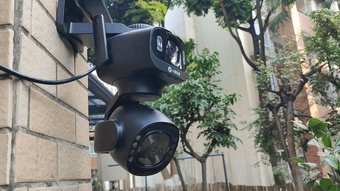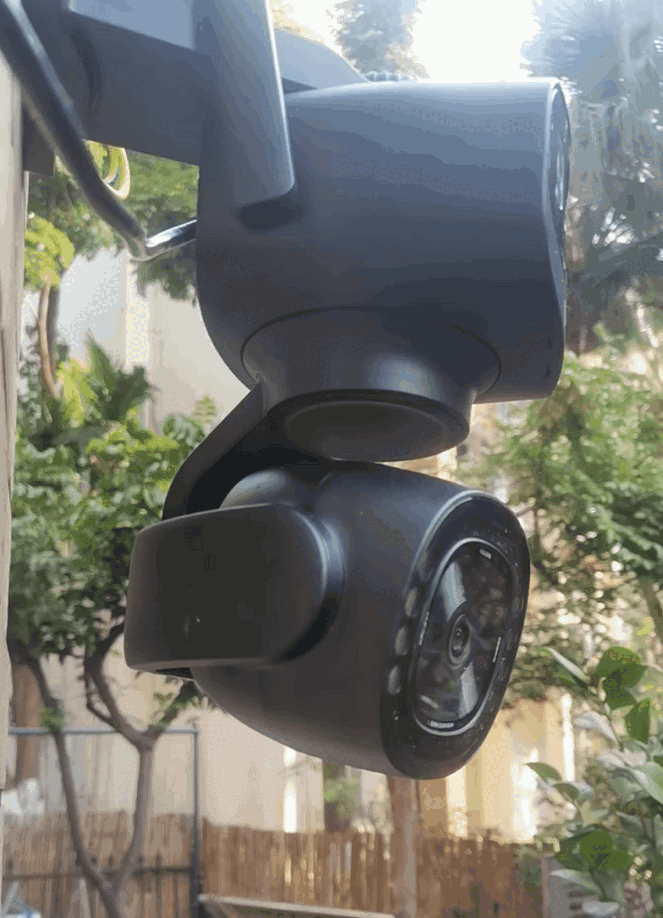 机身设计很戳人:线条硬朗带弧度,摸起来抗造。上下双镜头布局亮眼,上镜头可手动调 30° 垂直角,适配不同安装高度;下镜头带云台,340° 水平转、90° 垂直转,转动阻尼感刚好,不晃不松。两侧带有增强信号的天线,比单天线监控稳定可靠不少。