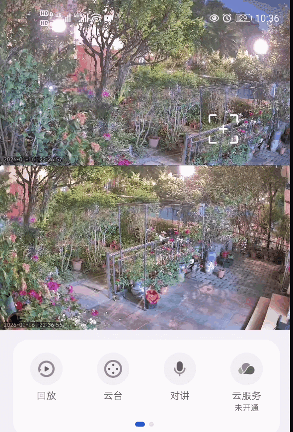 单镜头监控的痛谁懂?旧监控固定在角落,院子一侧的花丛永远是盲区。鲸瞳 Max 的双摄是真联动:上镜头 110° 广角紧盯全景,远处有动静第一时间感知;下镜头带 4 倍变焦,检测到人形就自动跟拍,全程不丢帧,在APP上面,点一下上镜头想看的区域,下摄像头就会自动转动点取的位置,远程观看非常的方便。