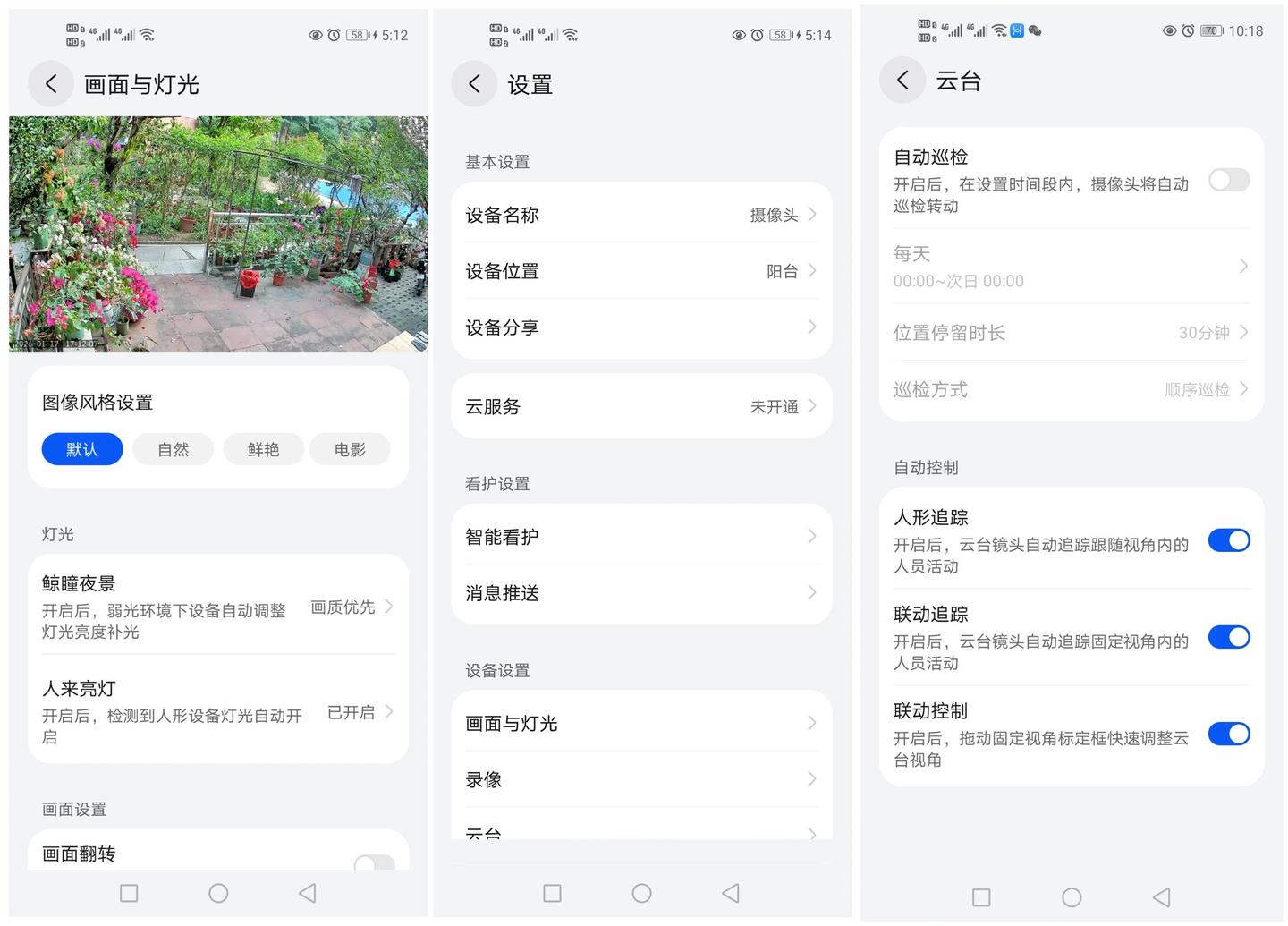 华为智慧生活 APP 界面清爽无广告,首页就是实时画面,下面一排云台控制、语音对讲、回访和多路常用功能,点一下就能使用,不用费心寻找。设置里还藏了细节:图像风格有默认、自然、鲜艳、电影 4 种,我试了一圈还是默认最真实;AI 侦测能单独开启全景或特写的功能,不用一刀切。