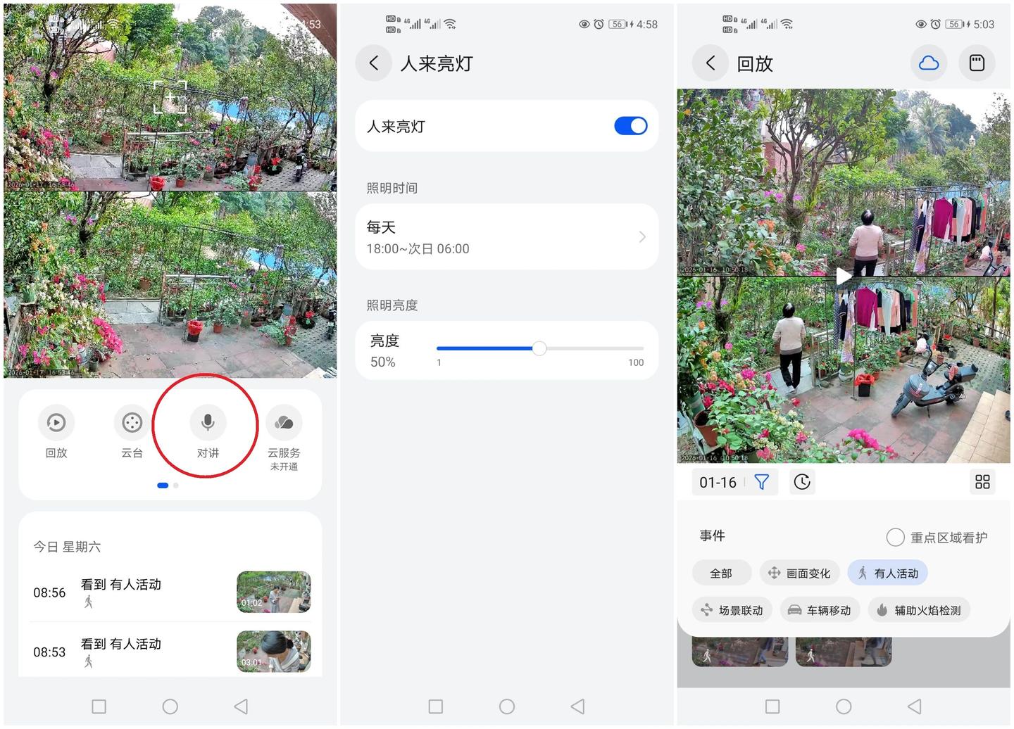 “人来灯亮”和“对讲”功能也很实用!有次摄像头侦测有人在大门口徘徊,我点开 对讲 功能,问对方是否有事情需要帮忙,对方听到后就立马离开,威慑力十足。而人来灯亮功能,一来可以照亮归家的路,二来陌生人进来的时候,也会发现有摄像头监控,方便之余也给人足够的安心。回放更是省事,