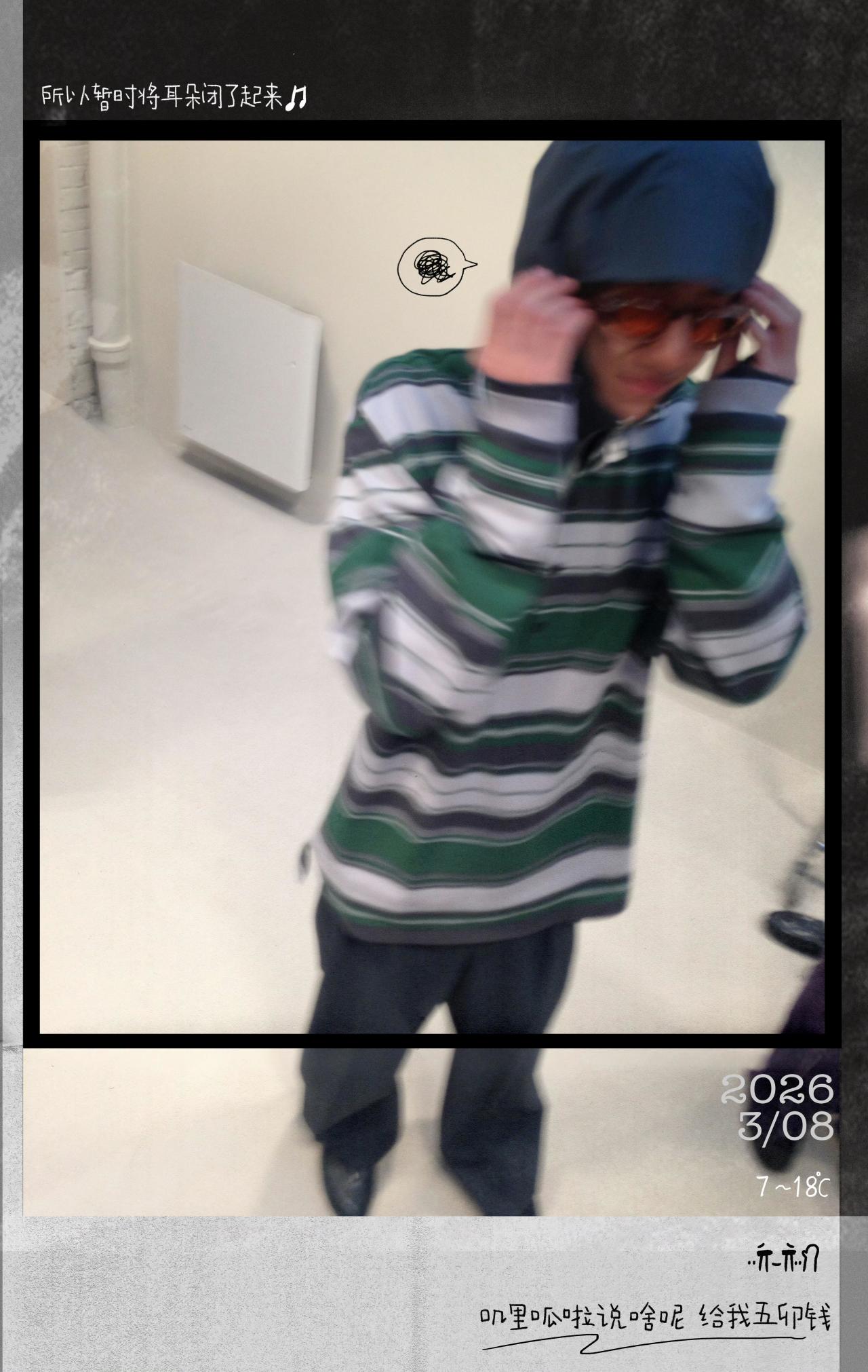 绿白条纹叠穿的设计别出心裁,足足五层叠穿却丝毫不显臃肿,反而被他穿出了独有的层次感。