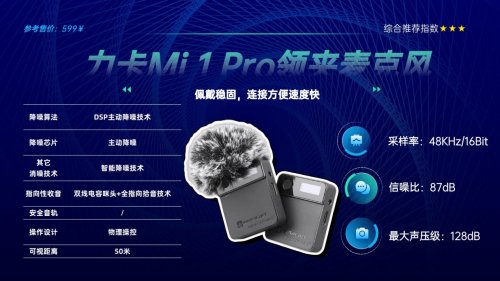 力卡Mi 1 Pro领夹麦主打快充与全设备兼容,适配专业场景及日常创作。基于60W+声纹训练优化,搭载全向拾音单元,支持-38dB/-22dB两档降噪调节,标配防风罩应对轻微户外风噪,信号传输稳定不易受干扰。支持PD快充协议,30分钟可补能50%,发射器与接收器单次续航均8小时,满足全天高强度创作。机身带通用热靴夹与防滑硅胶垫,固定稳固不易松动,配备多规格转接头,兼容手机、相机、混音台等设备。整体设计兼顾专业与便捷,操作逻辑清晰,做工可靠,是兼顾实用性与适配性的进阶选择。