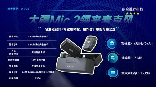 大疆Mic 2领夹麦主打专业收音与稳定传输,适配高阶创作及户外拍摄场景。搭载全向拾音单元,支持48kHz/24Bit采样与AI智能降噪,32bit浮点内录可修复失真音频,250米蓝牙传输抗干扰能力强,安全音轨功能避免素材丢失。发射器与接收器各重28克,背夹设计贴合衣领,体积小巧隐蔽性佳,无明显异物感。充电盒加持总续航18小时,支持Mi热靴供电,配备多规格接口兼容大疆生态及其他设备,做工扎实,整体风格简约专业,兼顾性能与可靠性。