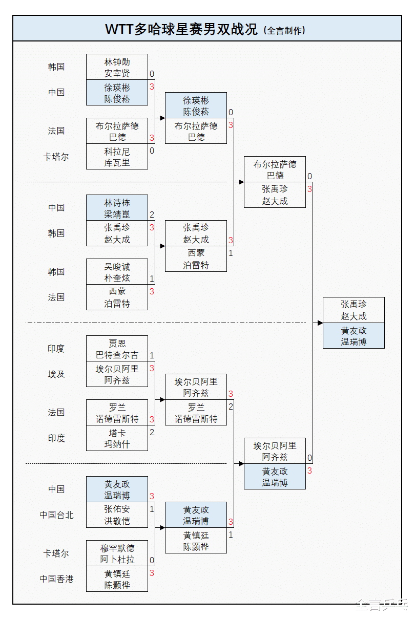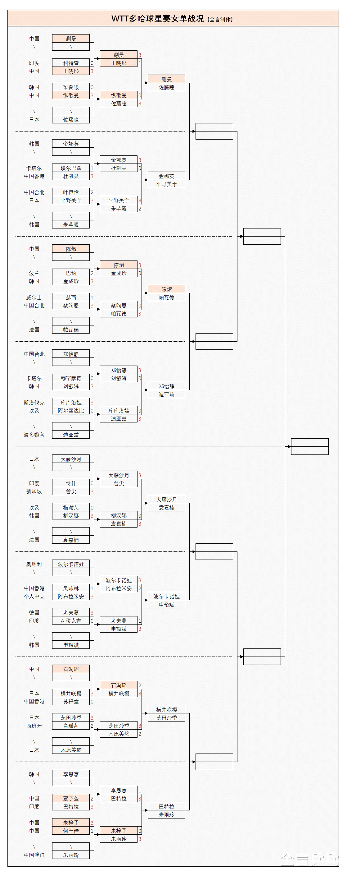 此外,中国队劲敌张本智和、张禹珍等人已经过关,至于中国台北名将林昀儒因为出现伤病而退赛,无缘继WTT多哈冠军赛登顶后背靠背夺冠——五项详细战况如下: