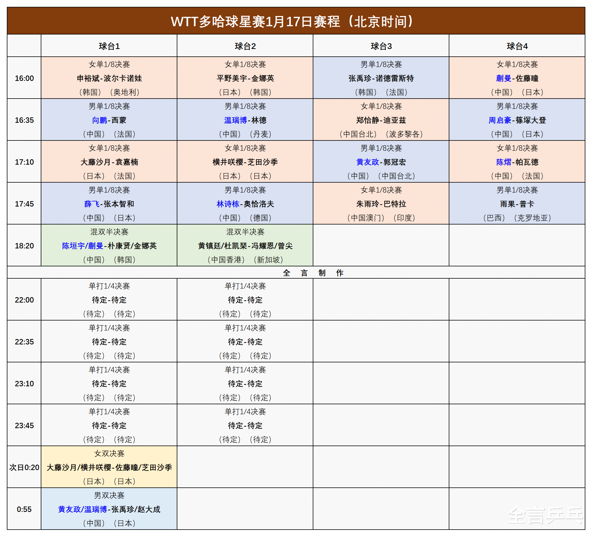 2026年1月17日,乒乓球WTT多哈球星赛将继续进行,目前单打16强已经全部诞生,国乒6男2女晋级;男女双打决赛名单出炉,国乒女双已输光,男双1对组合晋级决赛;混双4强也已出炉,国乒1对选手入围,有人欢喜有人愁。