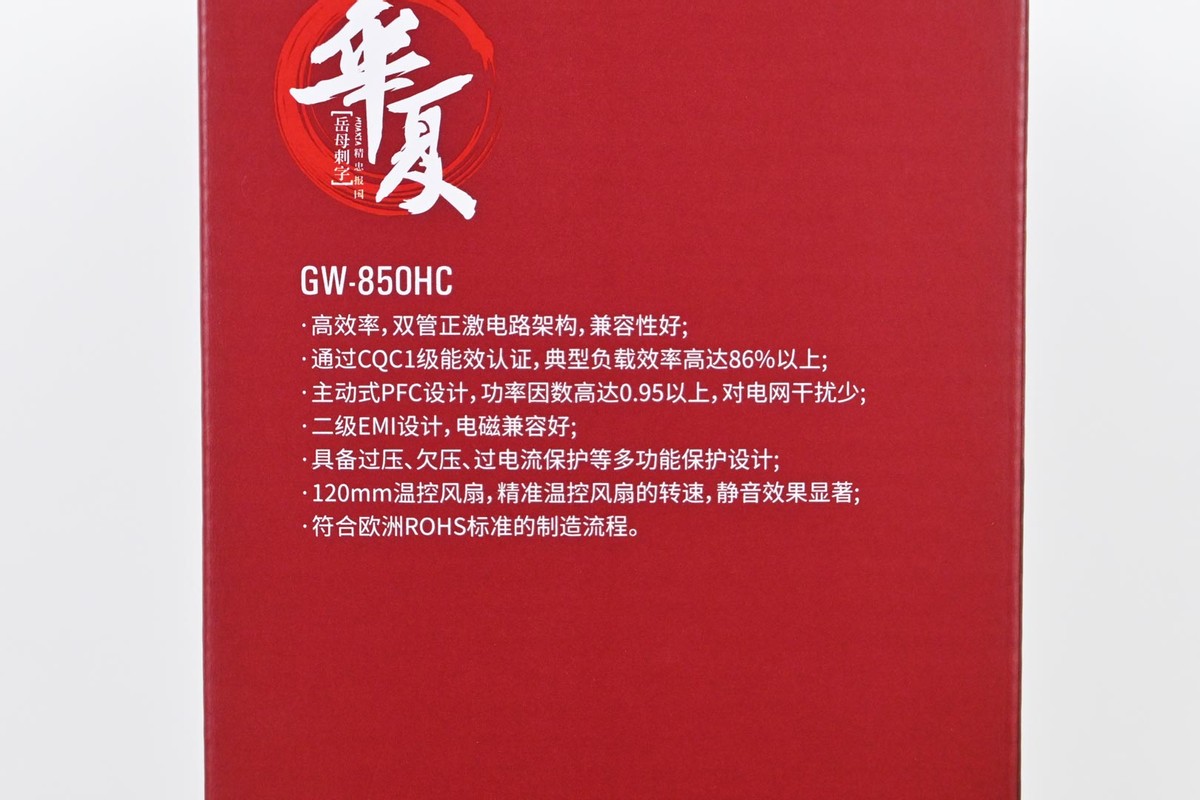 产品细节华夏GW-850HC机身尺寸为150mm x 140mm x 86mm,属于标准14CM短尺寸ATX电源规格,对大多数常规ATX机箱有着良好的装机兼容性,如果打算组装紧凑型MATX/ITX平 台建议选择全模组款式;电源本身散热策略支持温控,在低负载下会保持较低转速巡航,和新版华夏系列一样,华夏GW-850HC从龙形LOGO换成华夏字样作为正面LOGO。