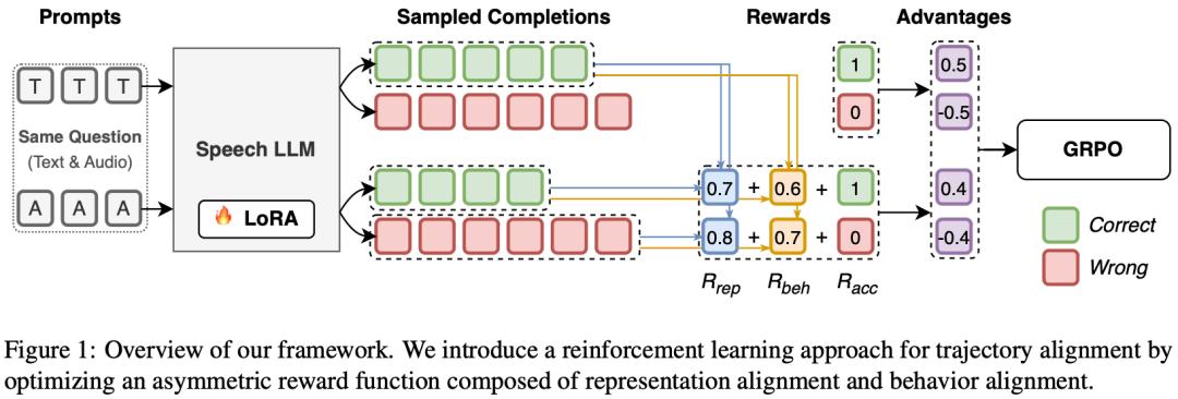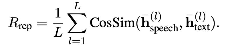 做法: 计算语音作为输入,推理过程中每一层的隐藏状态(Hidden States),与同一模型在文本输入下(文本输入和语音输入在语义上完全相同)的隐藏状态计算余弦相似度,作为表征对齐奖励。