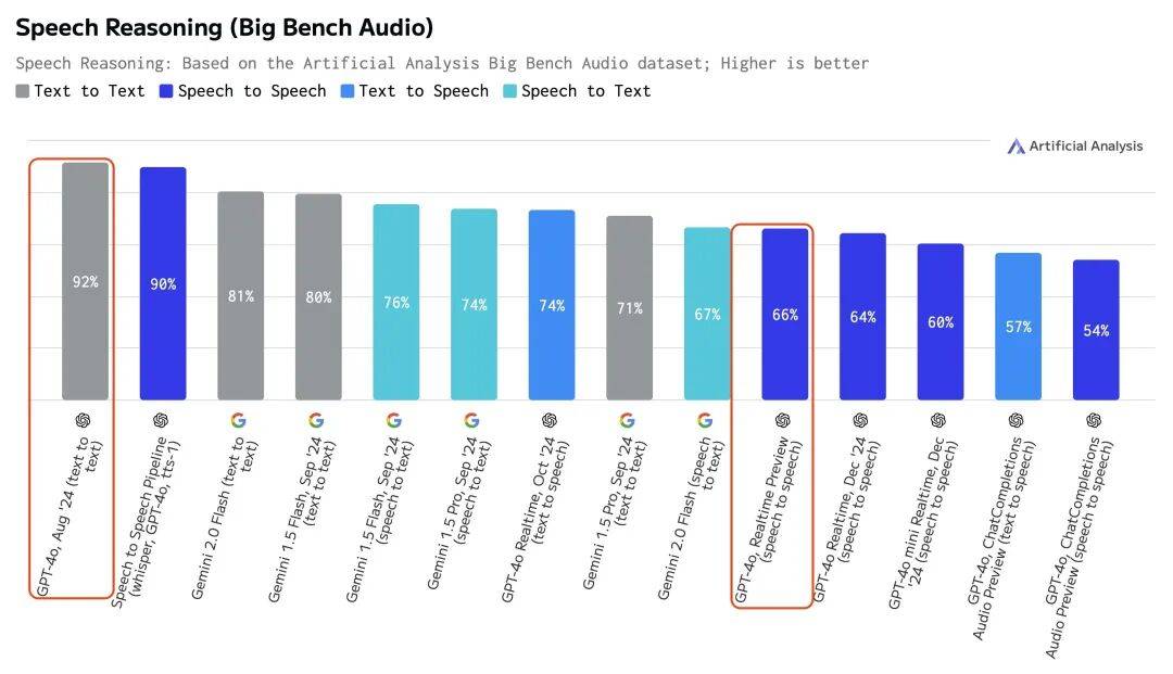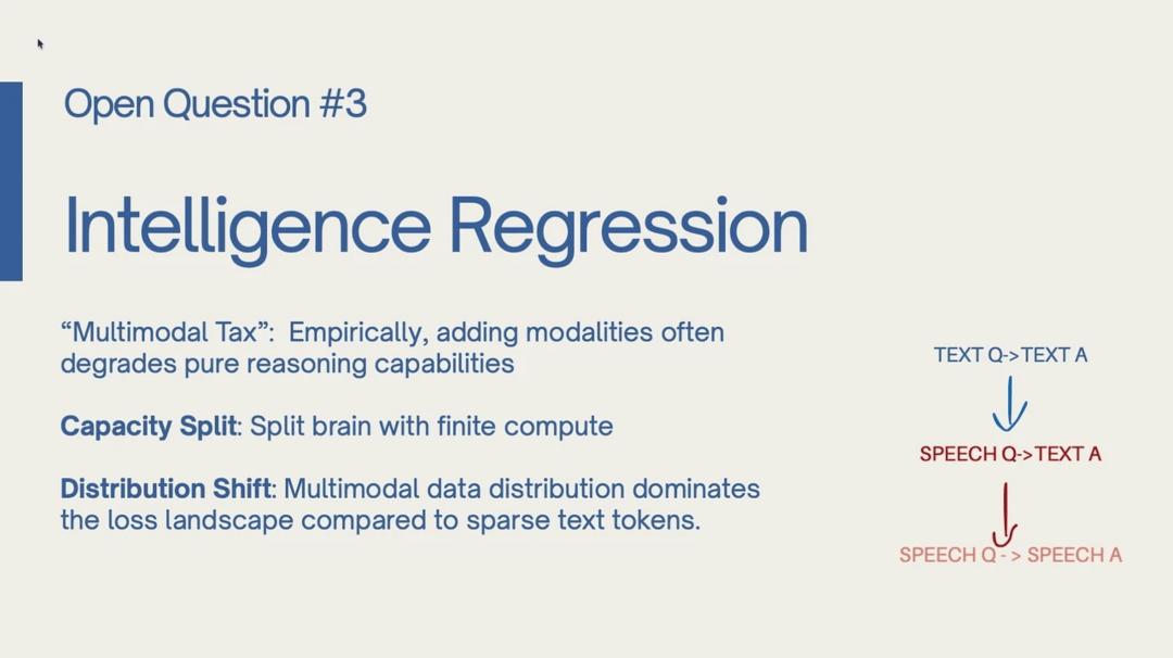 根据 Big Bench Audio 评测,以 GPT-4o 为例,在纯文本任务(Text-to-Text)的准确率达 92%;但一旦切换到端到端语音模式(Speech-to-Speech),其得分跌至 66%。这中间 26% 的巨大跌幅,就是模型引入语音而付出的代价。 Google Gemini 团队在技术分享中将其定义为 Intelligence Gap;而 Meta 研究员在 NeurIPS 2025 上更是直言这是一种 Intelligence Regression,并提出了一个生动的概念 Multimodal Tax,即引入音频等多模态数据往往会 “挤占” 模型用于纯推理的能力。