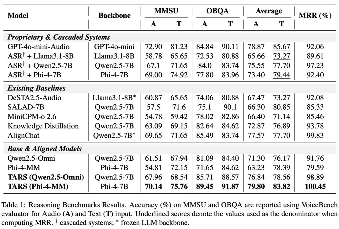 模态恢复率(MRR): TARS 在 7B 模型上达到了 100.45%(Table 1 最后一行)。这意味着,语音输入的推理能力不仅完全填补了引入音频带来的坑,甚至略微超过了文本基座的表现。