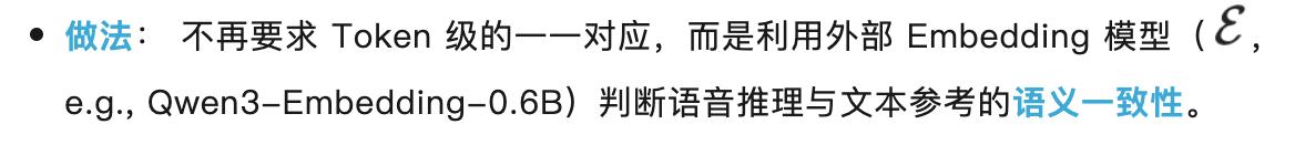 作用: 解决了 “目标不可达” 的问题。允许语音和文本在措辞上有差异,只要逻辑对、意思对就能拿分。这让模型在探索中学会了自我修正,而非机械模仿。 创新三:非对称奖励与模态归一化