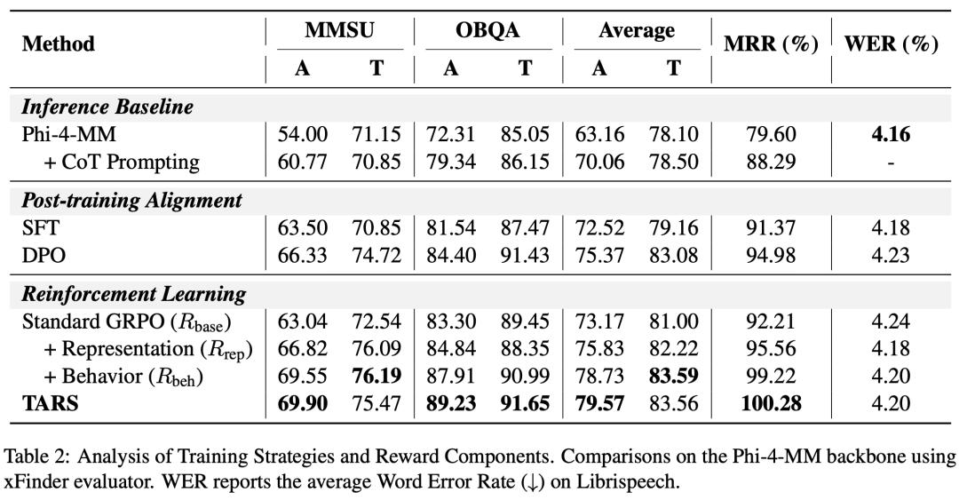 实验发现,TARS 的对齐并不是 “拆东墙补西墙”。在使用 TARS 训练后,模型的文本准确率也同步提升(Qwen: +2.39%, Phi: +5.43%)。这证明语音模态学习到的知识,能够同时增强文本的推理能力。