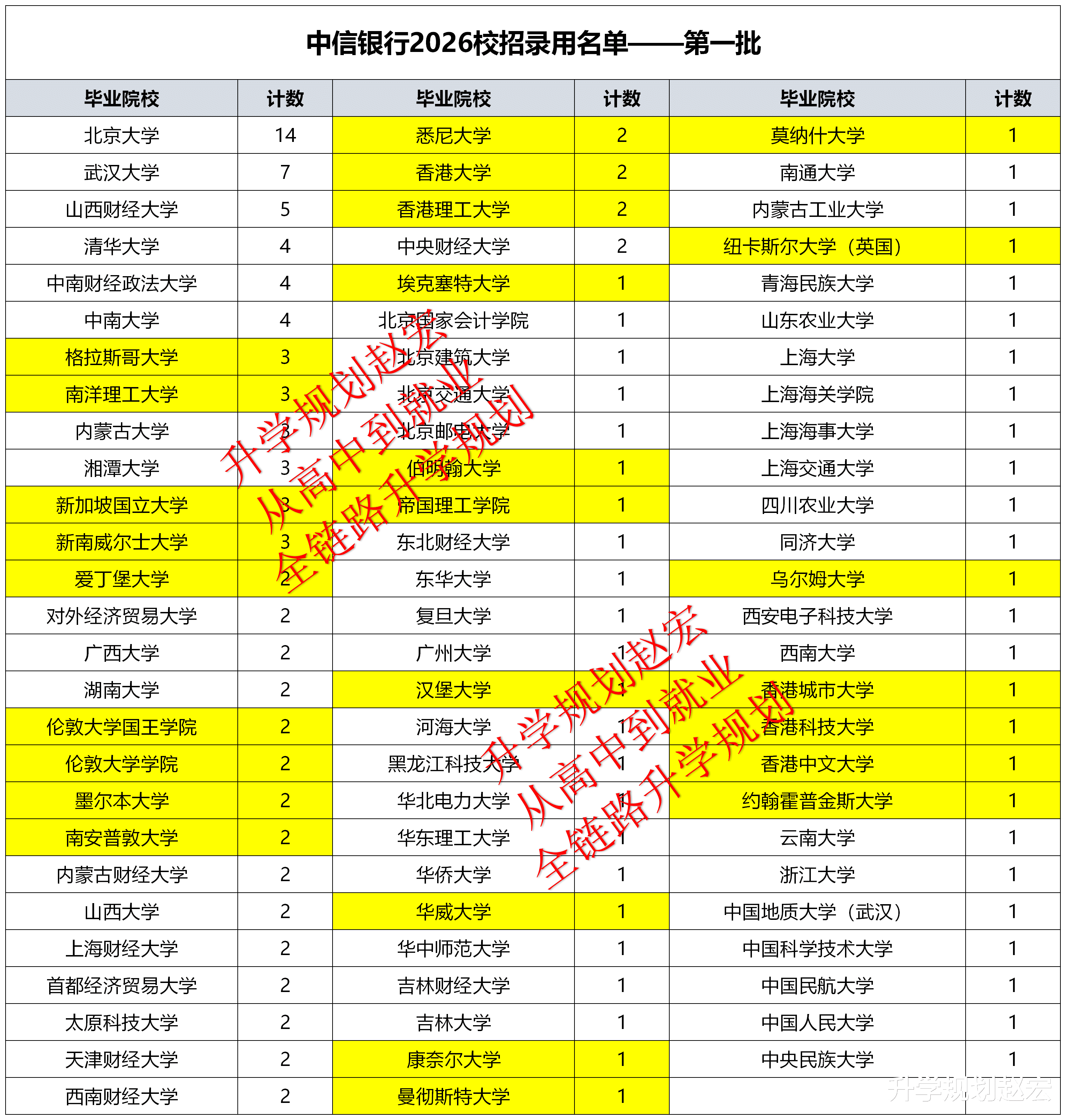 那本文咱们来看看中信银行2026年校招录用名单,第一批总共143人,生源院校80所,人数最多的是北京大学14人,然后是武汉大学7人和山西财经大学5人,接下来是清华大学、中南财经政法大学和中南大学4人。第一批人数不多,其实从数量上也看不到什么规律,大家可以多去对比往年的数据变化,以及具体的招录岗位要求。针对性的去做准备。除了人数较多的国内院校外,留学院校也比较多,本次80所院校中有26所,其实这个比例和往年整体招录数据也是差不多的。表面看起来有差异,其实看多了就有规律。
