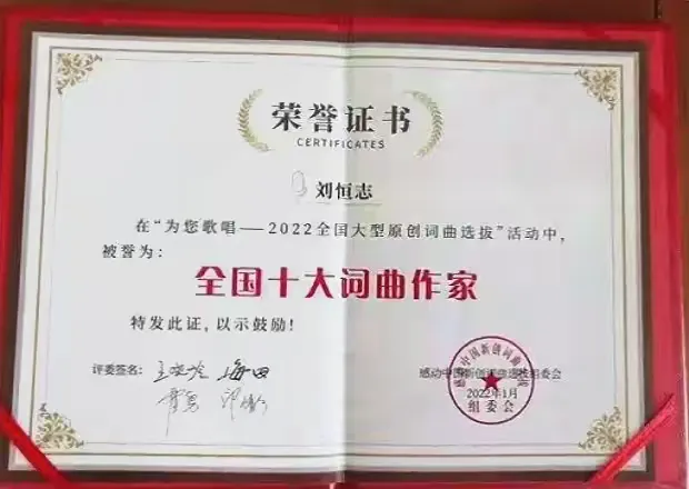因创作海军新时代军歌《走向深蓝》而成为“走向深蓝”一词发明人,在《感动中国》人民喜爱的艺术家全国听(观)众群众性评选中,凭借《走向深蓝》(霍勇演唱)、《海军蓝》《大海誓言》(吕继宏演唱)、《领航新时代》(刘丹丽演唱)、《撸起袖子加油干》(何沐阳曲、周深等演唱)、《农民父兄》(春雷演唱)、《我们是英雄护航兵》《奔向海洋-海军士官学校校歌》《我们一同走过从前》(康澎曲 董文华演唱)、《战士·界碑·祖国》(于乃久演唱)、《伴你人间天地情》(杜克曲 白雪演唱)、《军旗情》(朱虹演唱)、《更多的时候》《足迹》(楚兴元曲、杨洪基演唱)、《光照四季》(莎光曲 谭晶演唱)、《丽江酒歌》(许镜清曲、阎维文演唱)、粤韵歌曲《领航新时代》(刘恒志作词,陈仲琰、卢华作曲,叶幼琪演唱)、《启航》(万山红演唱)、《永远青春的中华魂》(戴玉强、黄华丽演唱)等,荣获“中国十大词曲作家”称号。
