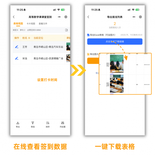 所有签到数据名单、时间、照片、定位等,都可以一键导出为Excel表格或压缩包。