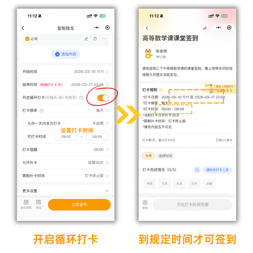 对于早晚自习、每周固定课程这种需要长期签到的场景,可以直接“开启循环打卡”。