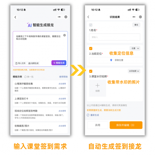 AI会瞬间理解,并生成:签到标题+签到说明+定位项+课堂水印拍照等内容