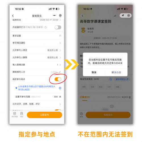 精准地点签到:设置签到有效地理位置(如教学楼、具体教室),学生必须进入该区域才能成功签到。