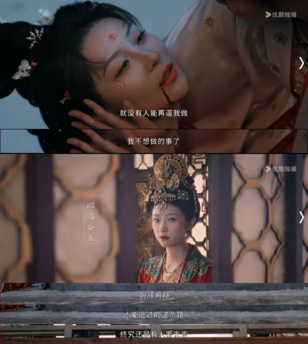 这整个过程无疑是剧中至为动人的,我们一次次看到悲壮震撼的女性抗争与互助情义。比如从不想被和亲摆布命运的十五公主,到不甘被困宫禁渴望自由的乐人玉书,前赴后继挣脱牢笼,甚至以死亡发出哀鸣呐喊。