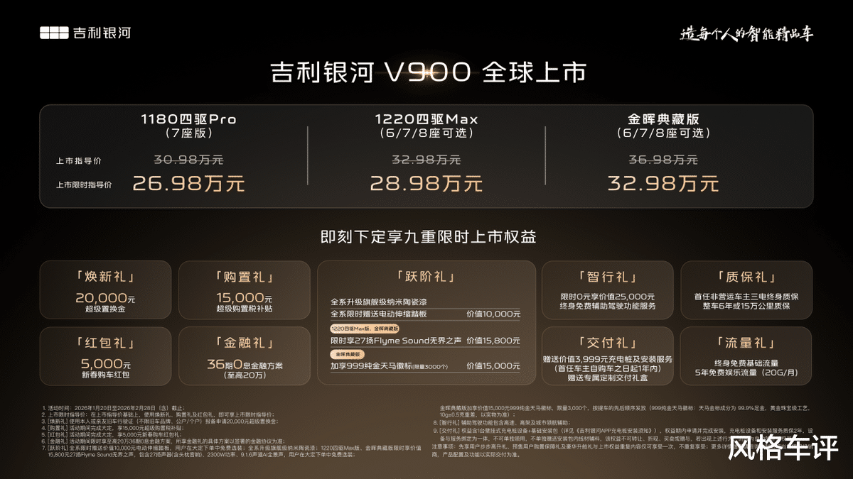 1月20日,吉利银河豪华V系列首发之作,“AI全场景家庭旗舰MPV”——吉利银河V900正式上市,共推出3个车型,上市限时指导价26.98万元-32.98万元。即日起,用户可通过吉利银河APP、微信小程序、抖音小程序及官网等官方渠道下订,下订即享焕新礼、购置礼、红包礼、金融礼、智行礼、质保礼、交付礼、流量礼、跃阶礼九重购车好礼,超高价值,一次满足,诚意拉满。