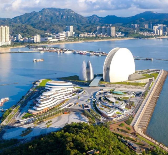 作为野狸岛的核心地标,珠海歌剧院“日月贝”坐落于海岛海滨,是中国唯一建设在海岛上的歌剧院。其设计灵感源于日月贝海洋生物,由一大一小两组贝壳状建筑构成,白天在阳光下泛着珍珠般的光泽,夜晚灯光亮起,与海面倒影相映,形成独特的景观。与之相连的海韵城,汇聚了书店、影院等配套设施,让艺术氛围与市井烟火气在此交融。
