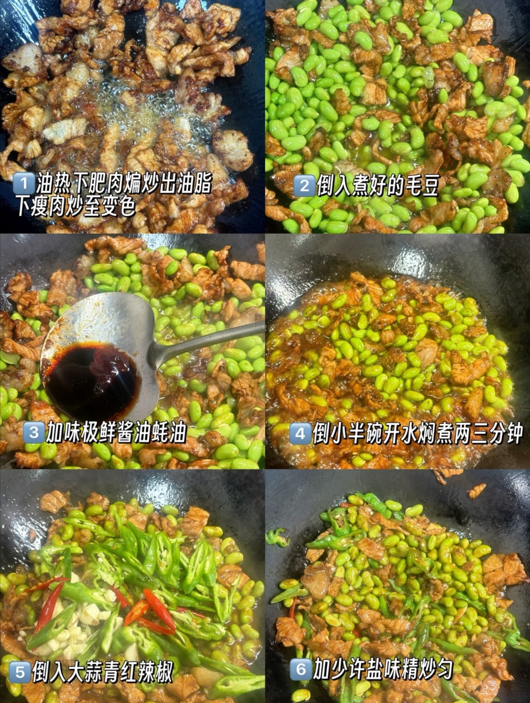 1. 宝宝友好版:给一岁多的小朋友吃,省略辣椒,调味料只放一点点盐和蚝油。毛豆要煮得更软一点,可以焖5分钟。肉片切得更碎,方便宝宝咀嚼。