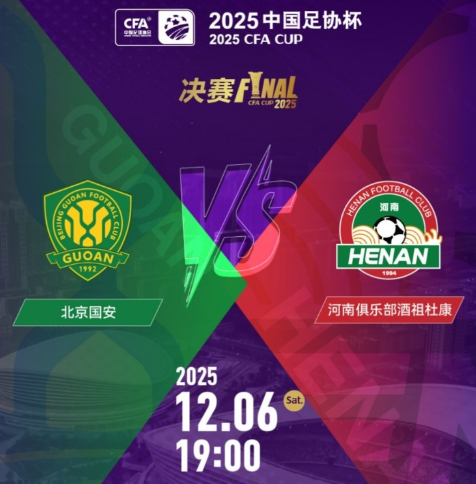 北京时间12月6日晚19点整,2025年足协杯将在苏州奥林匹克体育中心体育场迎来终极一战,北京国安与河南队将对2025赛