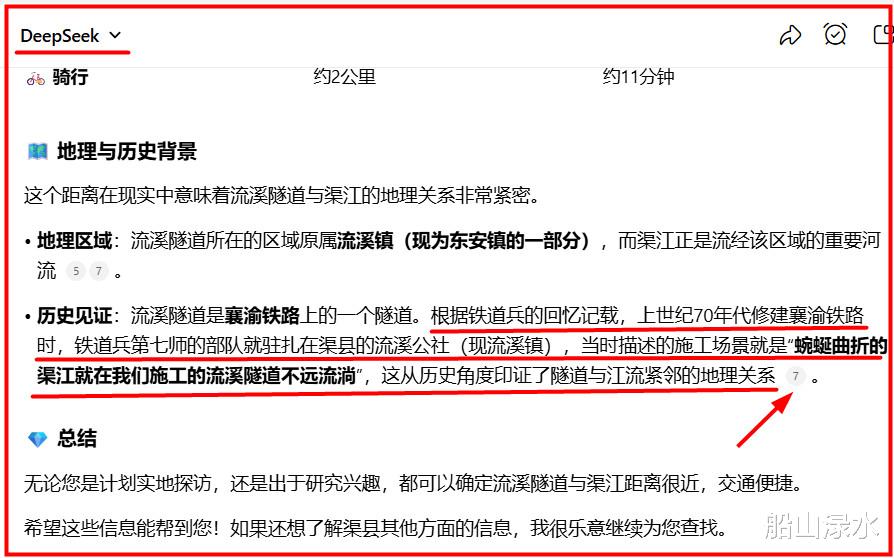 我向AI提了一个问题:襄渝铁路在四川渠县段的流溪隧道,离渠县的渠江有多远?