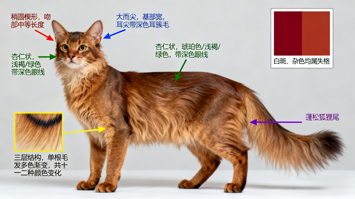 CFA 对索马里猫的判定标准极为严苛,核心要求包括:体型需为流线型中等体型,头部呈楔形,眼睛必须为琥珀色、浅褐色或绿色,被毛需为三层结构且呈丛生状,毛色需为深红色或棕红色的毛尖色斑纹。在猫展评分中,被毛与毛色占比最高,其次是体型与头部特征,不符合上述标准的个体无法参与赛事。