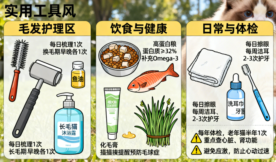 2. 寿命与体检平均寿命 12-15 年,良好养护条件下可延长至 17 年以上。建议每年进行一次全面体检,重点检查口腔健康、毛发状态与心脏功能;老年猫(10 岁以上)每半年体检一次,增加肾功能与甲状腺功能检测,及时发现潜在健康风险。