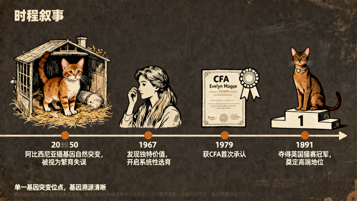 直到 1967 年,美国繁育者 Evelyn Mague 率先注意到这种突变个体的独特价值 —— 它们保留了阿比西尼亚猫的灵动体态与标志性斑纹,却多了一层飘逸的长毛,如同 “披了丝绒斗篷的阿比西尼亚猫”。她开始系统性选育这些突变个体,通过近亲繁殖固定长毛基因,同时引入优质阿比西尼亚猫血统优化体型与性格。1979 年,国际爱猫者协会(CFA)首次承认该品种,1983 年英国猫协会正式纳入品种标准,1991 年索马里猫在英国猫迷管理委员会赛事中夺得冠军,彻底奠定其高端长毛猫的地位。如今,索马里猫已发展出深红色、棕红色等多个色系,成为兼具野性美感与伴侣特质的热门品种,其基因溯源证明,所有个体的长毛性状均来自同一基因突变位点,是猫科动物基因演化的鲜活案例。