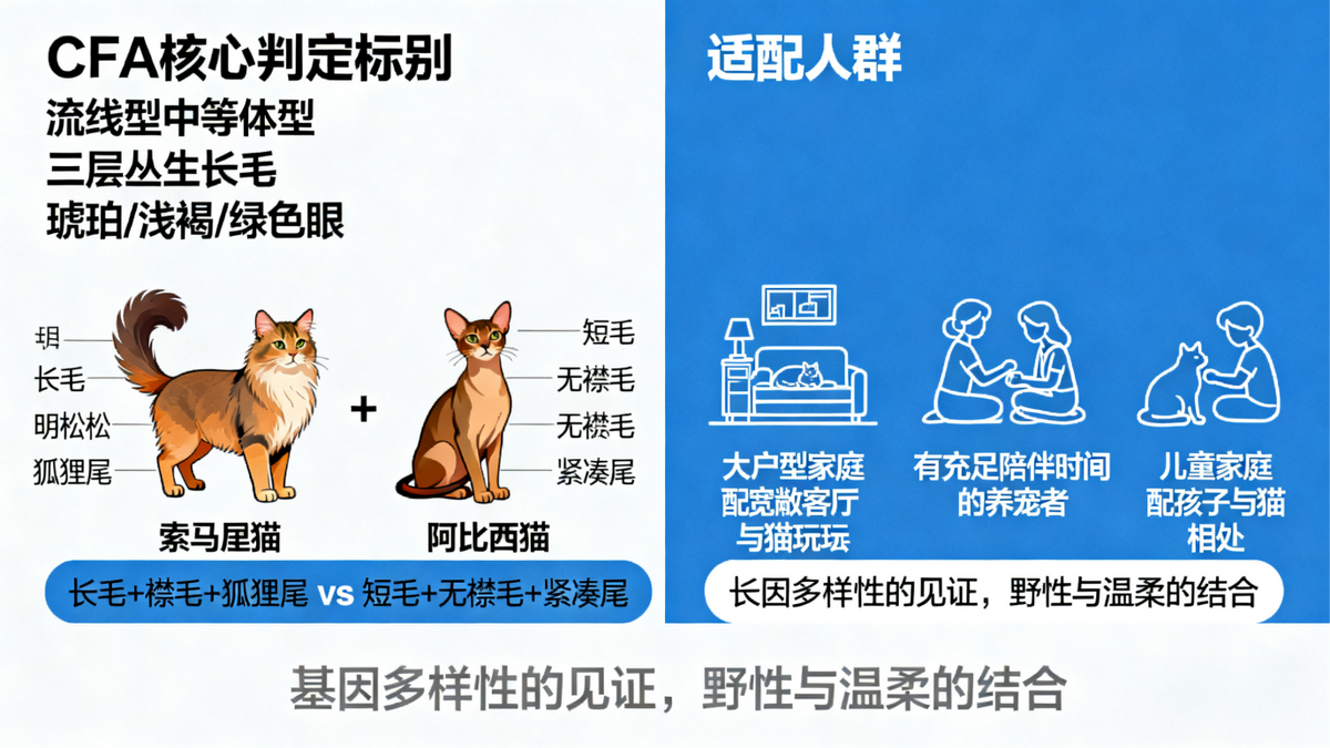 (二)与阿比西尼亚猫的辨别两者常被混淆,核心区别在于:索马里猫为长毛,有明显襟毛与狐狸尾,体型略丰满;阿比西尼亚猫为短毛,无襟毛,尾巴毛发紧凑,体型更纤细。此外,索马里猫的被毛渐变层次更丰富,而阿比西尼亚猫的斑纹相对简洁,可通过这些细节精准区分。