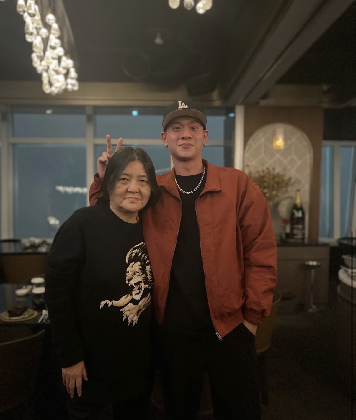 年夜饭桌上,一盏暖黄的光打在银筷子上,人声嗡嗡,笑闹不断。十来口人围坐,黑衣如墨,只有后排那个高个子男孩肩头一抹橘红——像一簇没压住的火苗。他叫邱煌祎,23岁,身高185cm,眉骨清晰,下颌线利落,戴一顶压低的渔夫帽,脖子上银链微晃。没人介绍他是谁,可当邱瓈宽挨着他站定、仰头靠过去拍合照,那种下意识的依偎,比任何台词都更直白:这孩子,是她亲手扶大的。