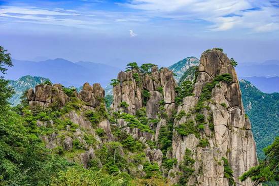 黄山:位于安徽省黄山市,山境南北长约40千米,东西宽约30千米;以奇松、怪石、云海、温泉、冬雪“五绝”及历史遗存、书画、文学、传说、名人“五胜”著称于世。另有“天开图画”、“松海云川”之称,黄山境内有大量的文化遗存,如古蹬道、古楹联、古桥、古亭、古寺、古塔等,另有现存摩崖石刻300余处,孕育了中国山水画“黄山画派”。