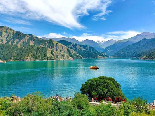天山天池:位于新疆,古称“瑶池”,湖面海拔1910米,南北长3.5千米,东西宽0.8~1.5千米,最深处105米。景区有15个景群,38个景点。以完整的4个垂直自然景观带和雪山冰川、高山湖泊为主要特征。